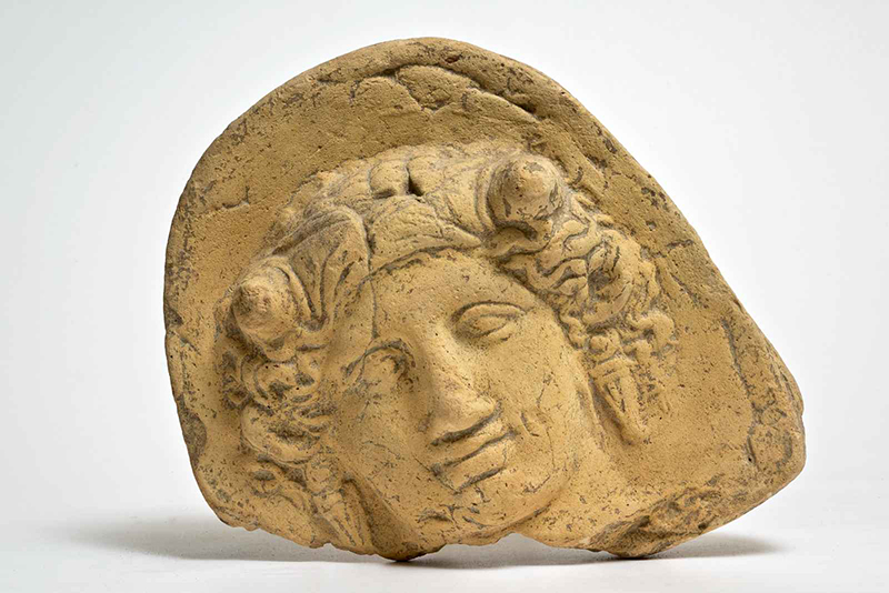Argilla di color beige, in frattura argilla rosata. Mancante nell'angolo inferiore sinistro fino al mento e all'orecchino. Il volto è quasi tondo, gli occhi leggermente infossati e le palpebre spesse, il naso dritto, le labbra carnose e la bocca chiusa. I capelli sono poco conservati, si notano le corna bovine che spuntano dalla sphendone e gli orecchini.