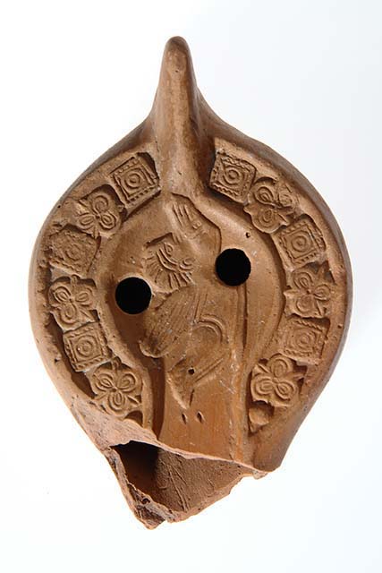 Lucerna africana. Ansa piena, puntuta. Nel disco concavo, a due «infundibula» obliqui, tozza figura d'uomo o erote alato volto a destra. Sulla spalla sette decorazioni geometriche per parte: quadri e fiori trilobati alternati ed una perla all'altezza del canale. Sottofondo piatto con piedino circolare al cui centro due circonferenze concentriche incise.
