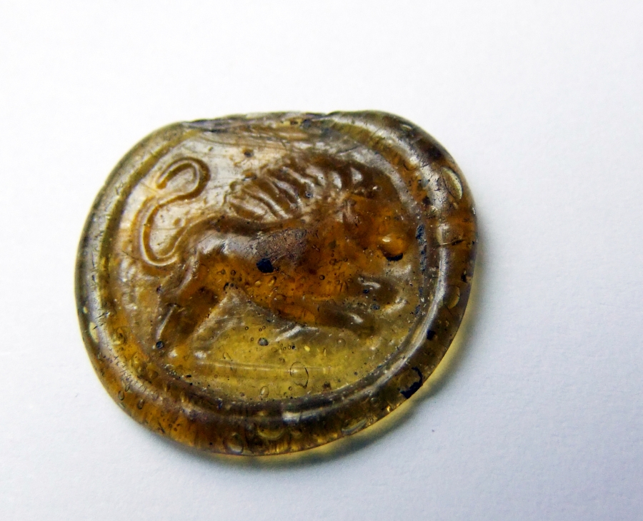 Forma circolare; bordo rilevato; appiccagnolo spezzato. Decorazione data da leone in corsa a ds.
