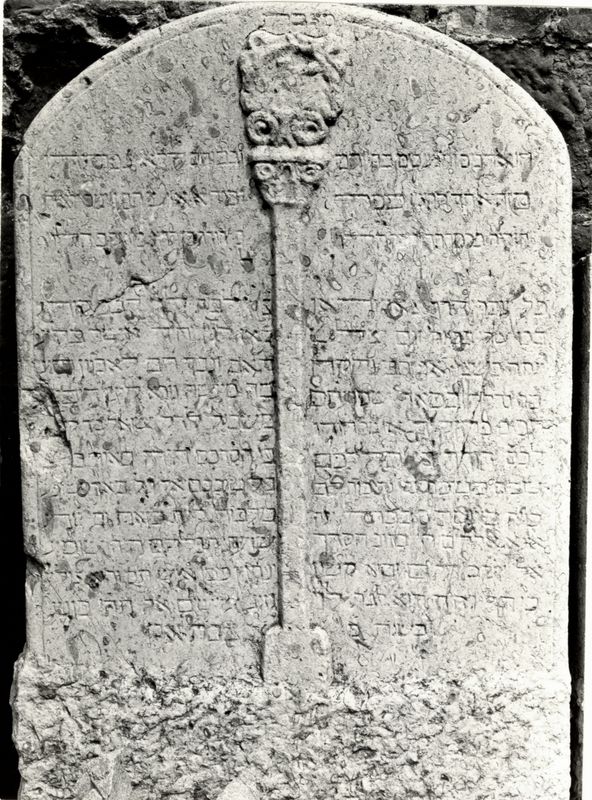 Lapide di forma rettangolare, coronata ad arco ribassato, con nel campo iscrizione su 15 righe in caratteri ebraici interrotte nel mezzo da una sottile colonnina a sezione quadrata, che poggia su una semplice base quadrata ed è sormontata da un capitellino composito con due volute su cui poggia lo stemma della famiglia Levi: una caraffa versa acqua in un bacino sottostante. L'iscrizione ricorda due defunti, nonno e nipote o zio e nipote, della famiglia Levi. Era stata datata al 1325, mentre lo studio di Sabbadini vi lesse l'anno 5493 corrispondente al 1733.