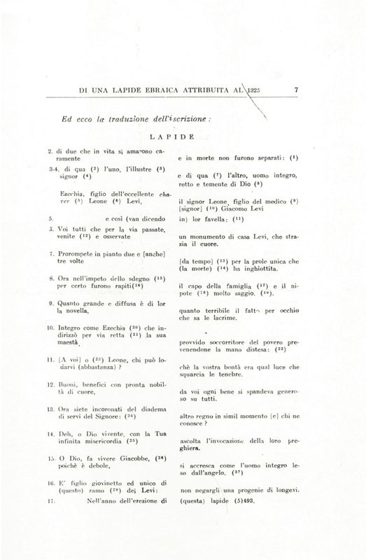 Lapide di forma rettangolare, coronata ad arco ribassato, con nel campo iscrizione su 15 righe in caratteri ebraici interrotte nel mezzo da una sottile colonnina a sezione quadrata, che poggia su una semplice base quadrata ed è sormontata da un capitellino composito con due volute su cui poggia lo stemma della famiglia Levi: una caraffa versa acqua in un bacino sottostante. L'iscrizione ricorda due defunti, nonno e nipote o zio e nipote, della famiglia Levi. Era stata datata al 1325, mentre lo studio di Sabbadini vi lesse l'anno 5493 corrispondente al 1733.