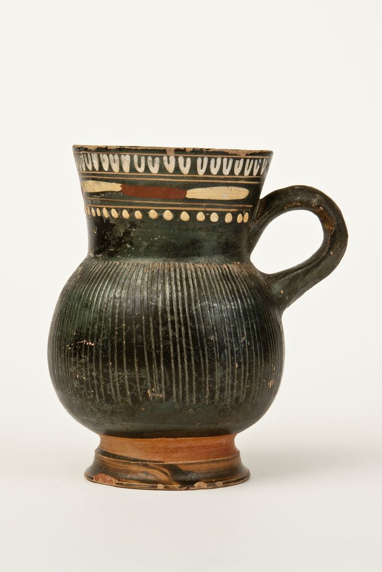 Boccaletto baccellato a vernice nera con sovraddipinture in bianco crema, giallo e rosso amaranto ed incisioni. Orlo estroflesso, collo troncoconico, corpo globulare strigilato, ansa a nastro, ad anello verticale, schiacciata, gola di raccordo, piede troncoconico modanato. Sotto l’orlo: tra una linea incisa e due coppie di linee incise, ovuli dipinti in bianco e tremuli giallo-rossi; sotto la seconda coppia di linee incise compare una fila di punti in giallo.