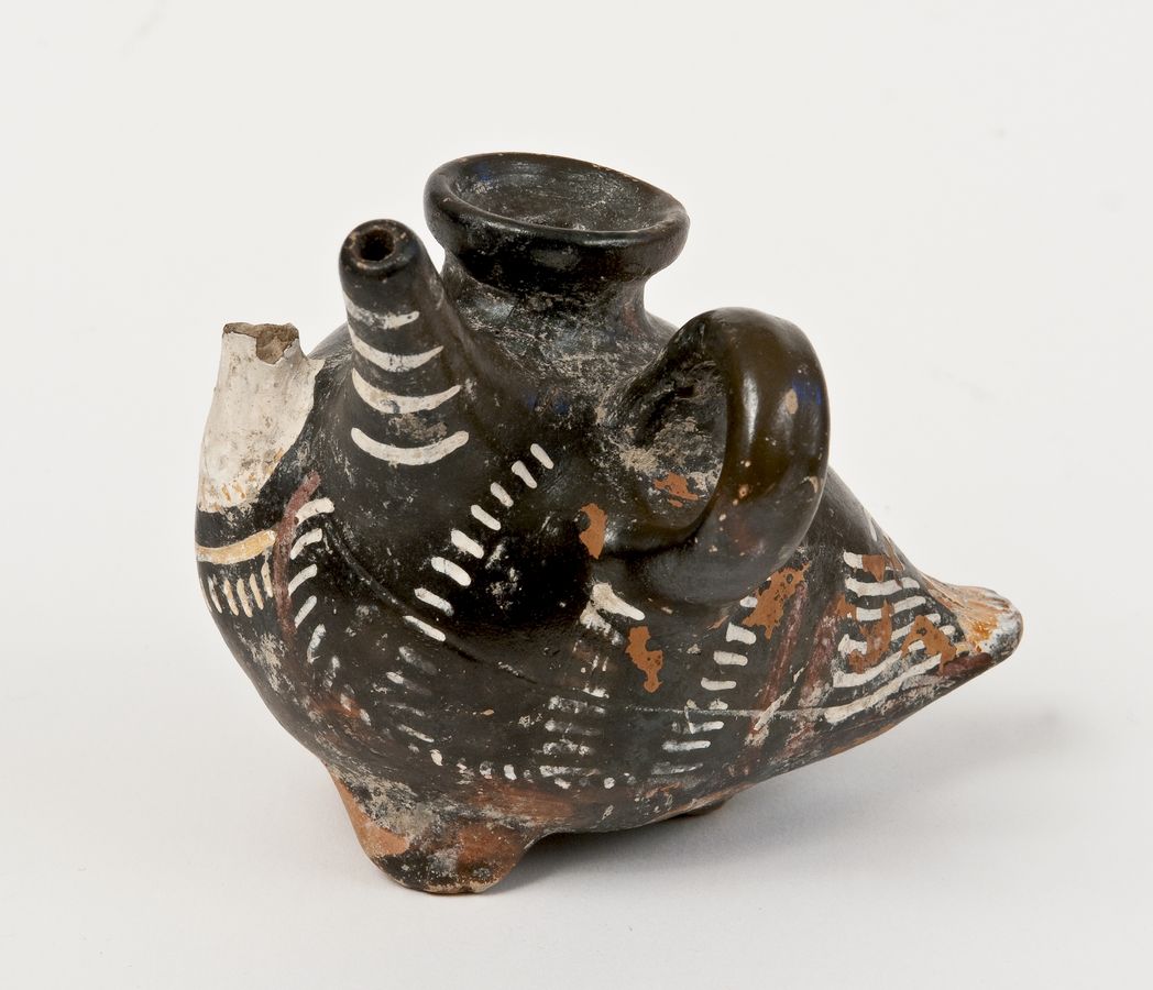 Guttus a poppatoio a forma di uccello a vernice nera con sovraddipinture in bianco, giallo e rosso amaranto. Corpo conformato a quello di un volatile, presenti sullo stesso lato sia il poppatoio che l’ansa a nastro. Corpo: decorato da linee in rosso che riprendono il profilo plastico del vaso e da bastoncelli in bianco e giallo che, in modo diverso, vanno a riempire il corpo delineato.