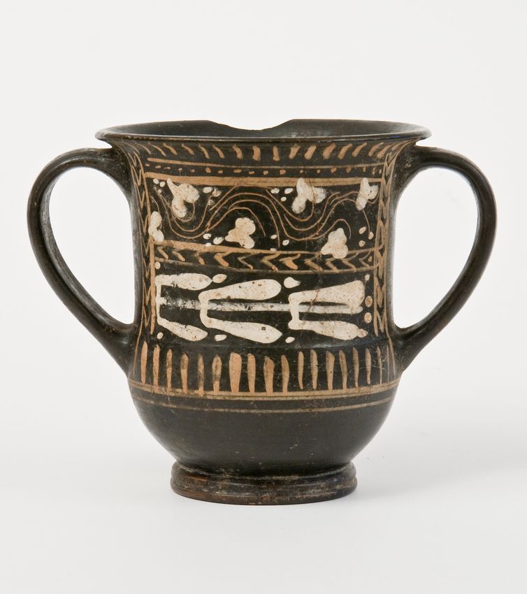 Kantharos sessile a vernice nera con sovraddipinture in bianco crema e giallo-arancio ed incisioni. Orlo estroflesso, collo a profilo concavo, corpo ovoidale, anse a nastro verticali, piede a tromba. Lato A: Lungo l'orlo fila di bastoncelli, seguiti da due linee dipinte, una più sottile in bianco, l'altra più spessa in giallo-arancio, che racchiudono una fila di punti. Sul collo, tralcio di edera con stelo sinuoso inciso e ramo di alloro con bacche, inquadrati lateralmente e divisi tra loro da Chevron, tra linee dipinte. Alla base del corpo bastoncelli in giallo-arancio e linea dipinta nello stesso colore. Lato B: stessa decolorazione, con ordine degli elementi vegetali invertiti: ramo di alloro con bacche, Chevron tra linee di tralcio di edera con stelo sinuoso inciso.