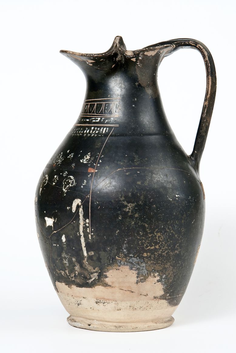 Oinochoe con due kantharoi a vernice nera con sovraddipinture in bianco, giallo e rosso ed incisioni. Orlo trilobato, largo collo a profilo concavo, corpo globulare espanso, ansa a nastro leggermente obliqua, basso piede ad anello. Sul collo: tra tre coppie di linee incise, sequenza di ovuli incisi e dipinti con punti in bianco, meandro, pendenti lunghi campiti su gruppi di tre punti in bianco. Sul corpo: inquadrato da due rami secchi dei quali sono rimasti visibili solo gli steli incisi e qualche punto, tralcio di vite a pergolato, sotto il quale sono due kantharoi, su fila di punti in bianco, divisi dal tralcio di vite ed affiancati alle loro estremità laterali da due bende pendenti.