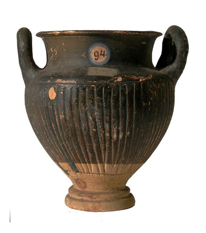 Stamnos a corpo baccellato con due anse arcuate verticali su alto piedistallo a due elementi; vernice nera con sovraddipintura perduta con coperchio baccellato.