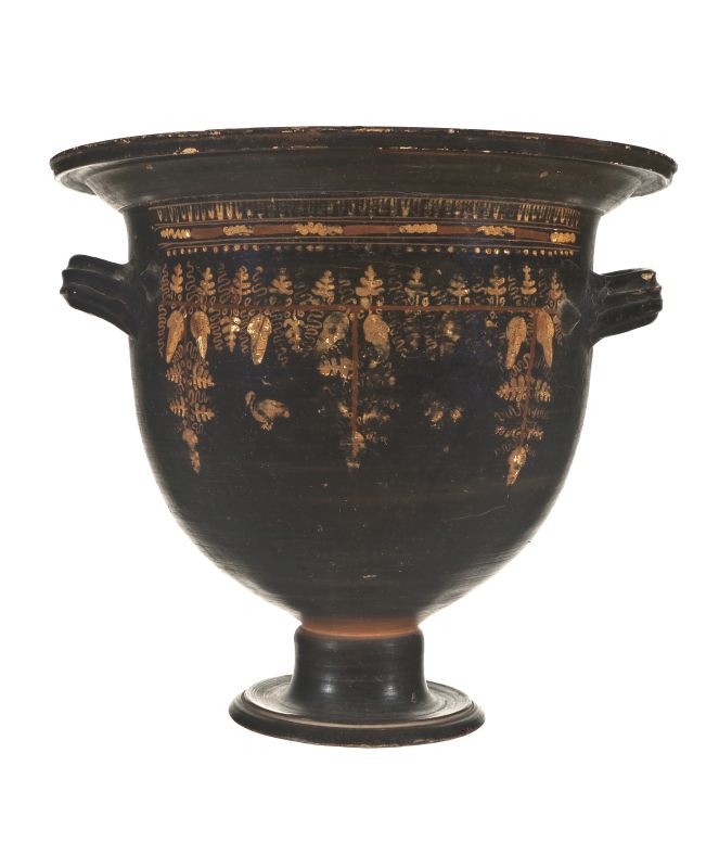 Cratere a campana con cigni a vernice nera, a tratti più chiara, con sovraddipinture in bianco, giallo, oro e rosso amaranto ed incisioni. Labbro espanso, revoluto modanato, orlo estroflesso, vasca profonda, ansa a nastro, impostate orizzontalmente sotto l’orlo, gola di raccordo, alto piede campanulato. A: Sotto l’orlo tra una linea e due coppie di linee incise, sequenza di ovuli dipinti in giallo e tremuli in giallo-rosso, segue una fila di punti in giallo. Sul corpo tralcio di vite a pergolato con stelo rosso, grappoli, pampini e viticci, in giallo, per metà più chiaro e metà più scuro. Sotto il pergolato si intravedono, appena, le sagome di due volatili, probabilmente due cigni. B: Sopra delle appendici coniche, si dipartono due corti tralci di edera a stelo inciso, ricurvi.
