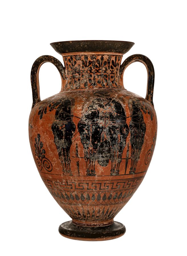 Anfora a figure nere con colori aggiunti e graffito. Lato A: Una quadriga è raffigurata di prospetto: sul carro si intravede l’auriga e alle sue spalle un guerriero con elmo corinzio che impugna due giavellotti e il kentron. Lato B: Un uomo anziano stante si appoggia a un bastone e porge una spada al giovane guerriero, armato di corazza, che si china per indossare il secondo schiniero, mentre il suo elmo attico è ancora a terra; a destra, una donna gli porge la lancia e lo scudo concavo. Sotto la base è inciso il marchio con lettere in legamento: HP