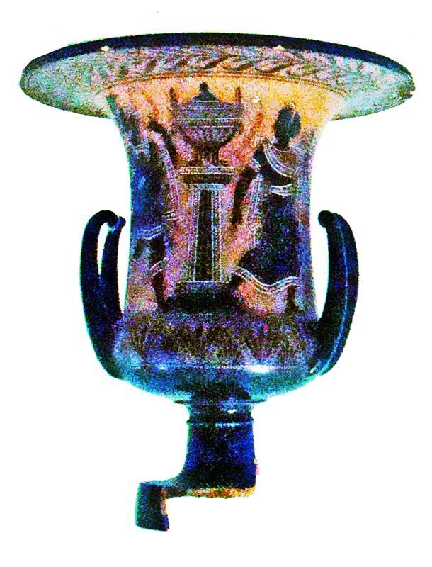 Cratere a calice falso a figure nere. Lato A: scena di sacrificio: davanti ad un altare un guerriero e una sacerdotessa. Lato B: scena di offerta davanti a uno stamnos posto su un pilastro con un guerriero e una sacerdotessa.