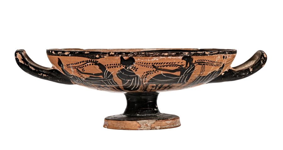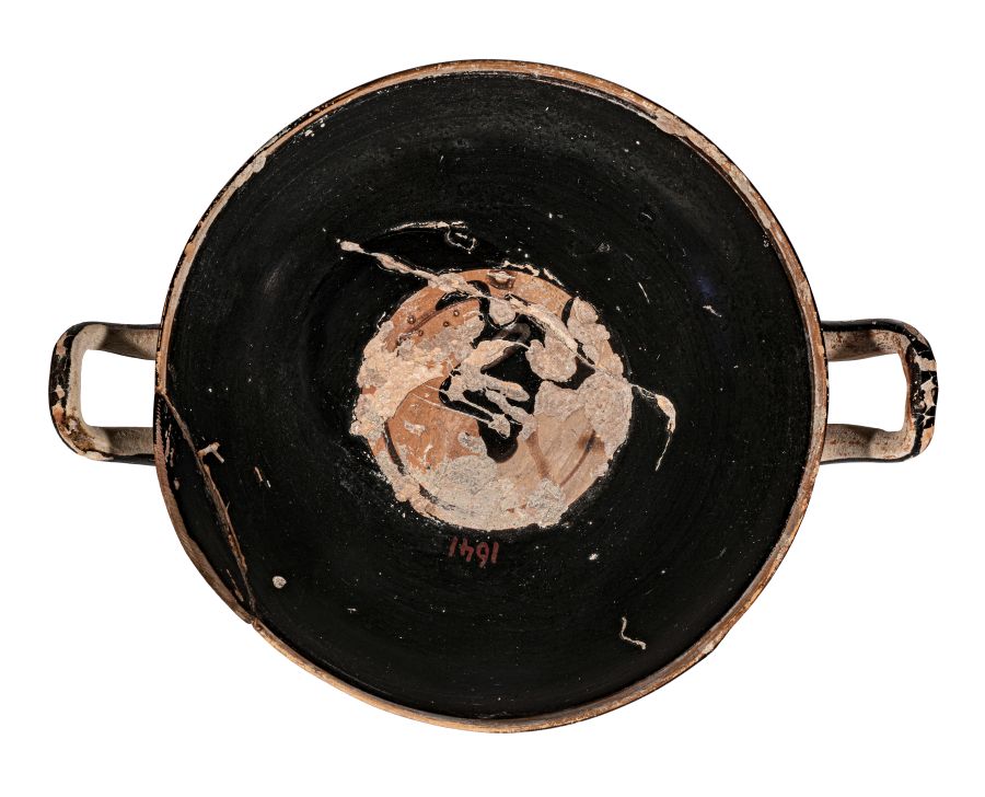 Kylix priva dello stelo attica a figure nere con colori aggiunti e graffito. Su ciascun lato si dispongono cinque personaggi. Accanto alle anse due personaggi femminili sono seduti su un diphros okladias, di profilo verso il centro della scena. Indossano un lungo himation drappeggiato e portano un’acconciatura raccolta. Presso di loro, rivolti entrambi verso sinistra, due figure maschili distese su kline. Sono senza barba, si appoggiano al braccio destro, mentre quello sinistro è alzato verso le donne. Anch’essi sono coperti da un himation drappeggiato e davanti a loro stanno basse mense da cui pendono otri. Al centro della scena, rispettivamente, sul lato “A”, in piedi verso destra, una donna con acconciatura raccolta ed un himation, mentre sul lato “B” un uomo, sempre avvolto da himation e coperto con un cappello a larghe falde. Sullo sfondo corrono tralci di vite con foglie a puntini. Il colore bianco viene impiegato per l’incarnato dei personaggi. A graffito vengono resi i panneggi delle vesti. Stile rozzo e corrente ma l’uso graffito per i particolari interni delle figure permettono di attribuirlo al Pittore di Caylus.