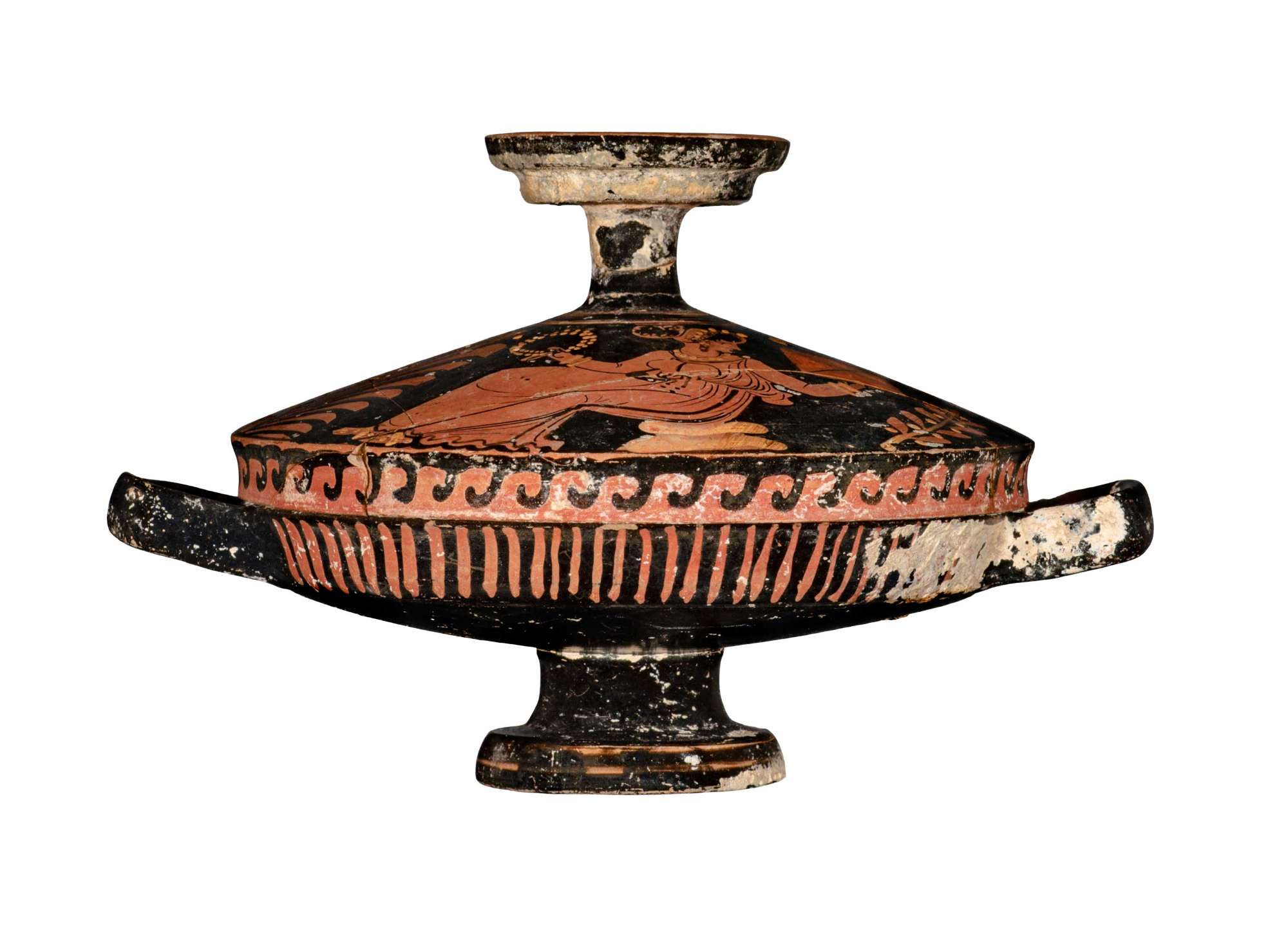 Coppa di lekanis aapula con fascia decorativa a linee verticali tra le anse. Coperchio di lekanis apulo a figure rosse. Lato A: giovane nudo seduto con patera e diadema sul capo; Lato B: donna in chitone seduta con scrigno e corona di corimbi nelle mani. Tra A e B due palmette.