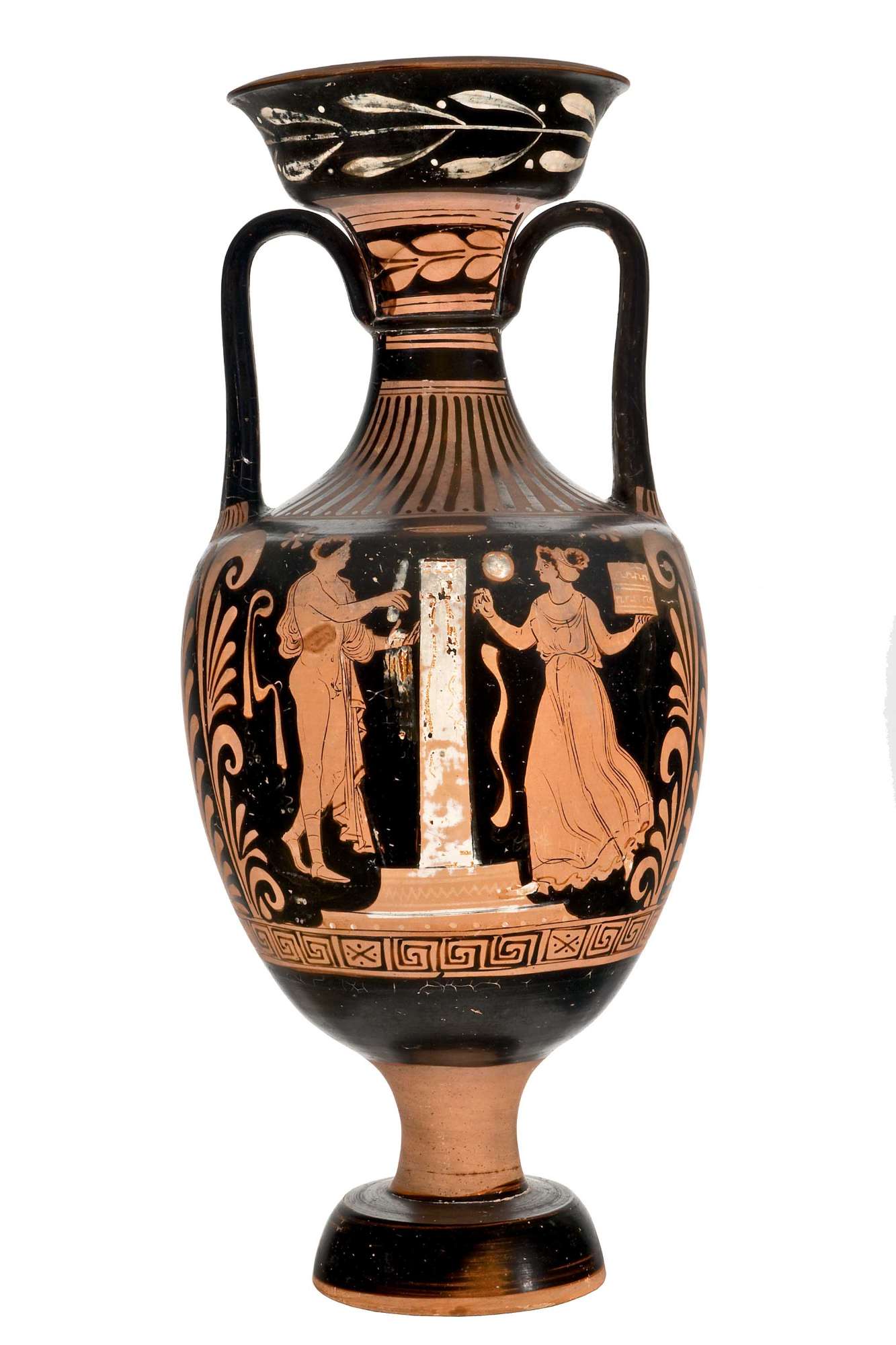 Anfora panatenaica apula a figure rosse. Lato A: scena di offerta: una colonna con grande bacile sulla sommità, ai lati un giovane nudo con alabastron e una donna con specchio e cista. Lato B: due giovani ammantati, coppia di halteres.