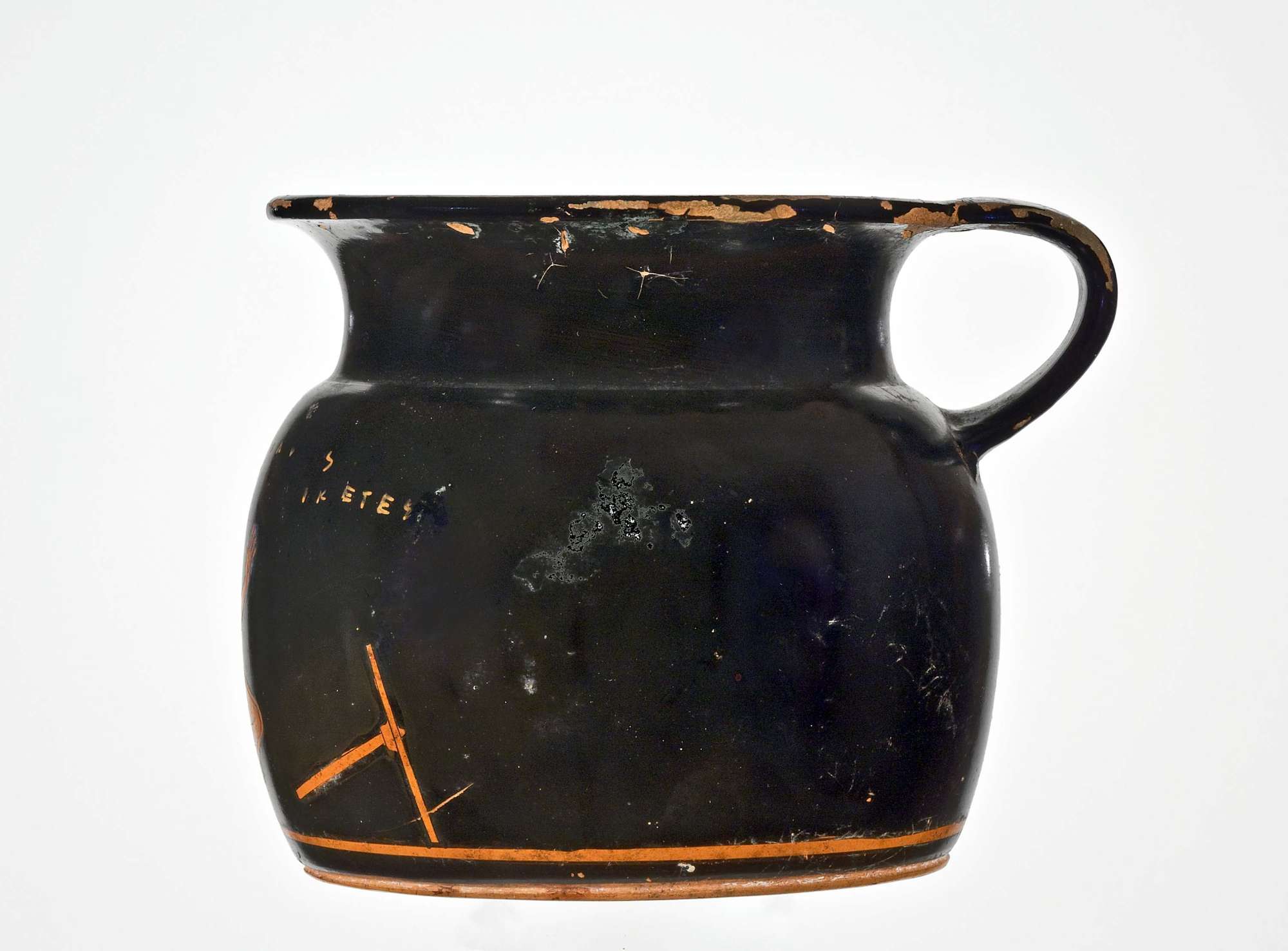 Boccale a figure rosse con immagine di un atleta in atto di saltare; piccozza poco più avanti; Iscrizioni: KALòS HIKèTES (bello è Ichete).