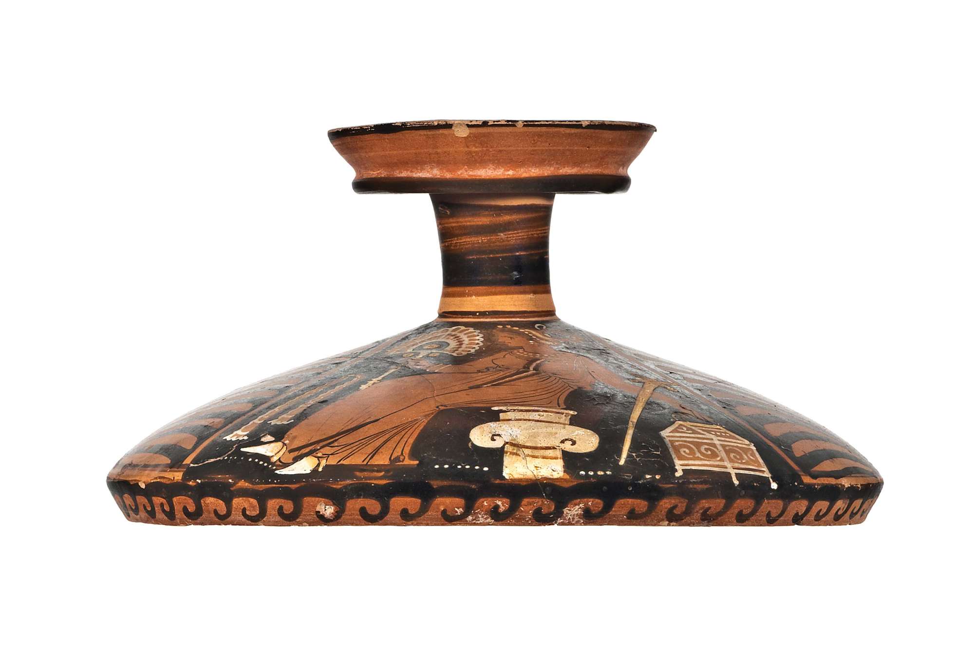 Coperchio di lekanis apula a figure rosse. Lato A: Eros seduto con specchio. Lato B: donna seduta su colonna con capitello ionico, con ventaglio e cassetta a girali; dettagli bianchi sovradipinti.