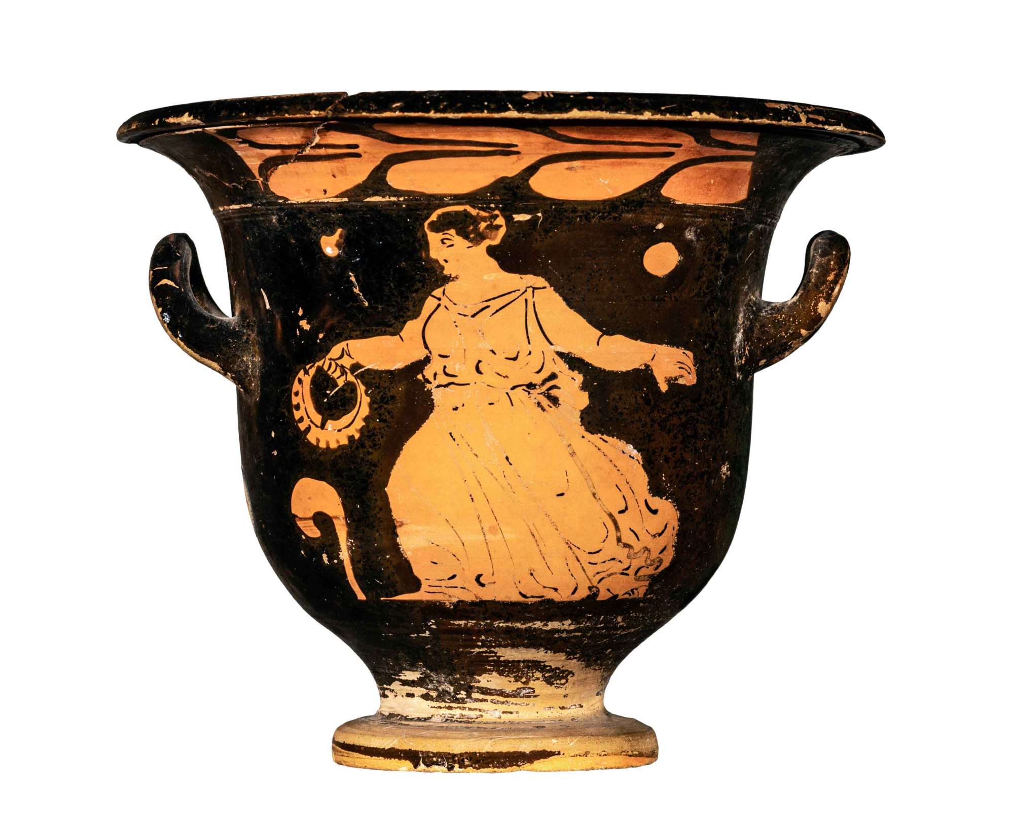 Cratere a campana apulo a figure rosse. Lato A: giovane nudo; Lato B: donna in corsa