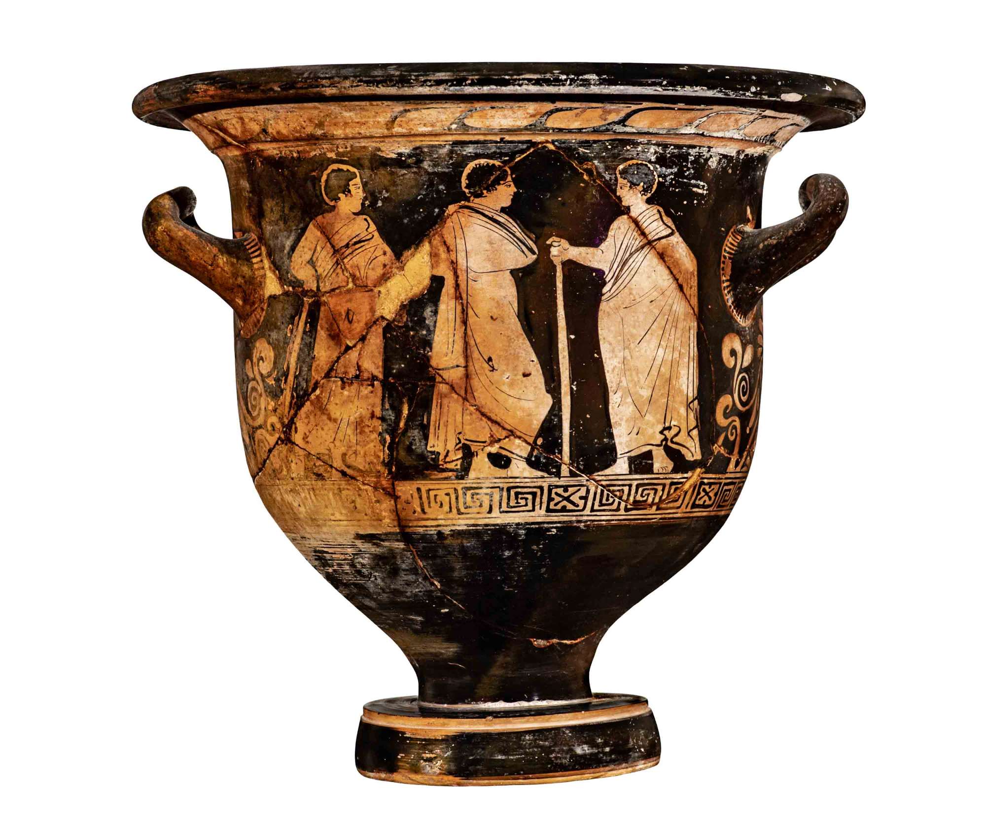 Cratere a campana a figure rosse. Lato A: Dioniso satiro e menade nuda (secondo scheda, gioco del kottabos, ma mancano elementi del lancio). Lato B: tre giovani vestiti ammantati.