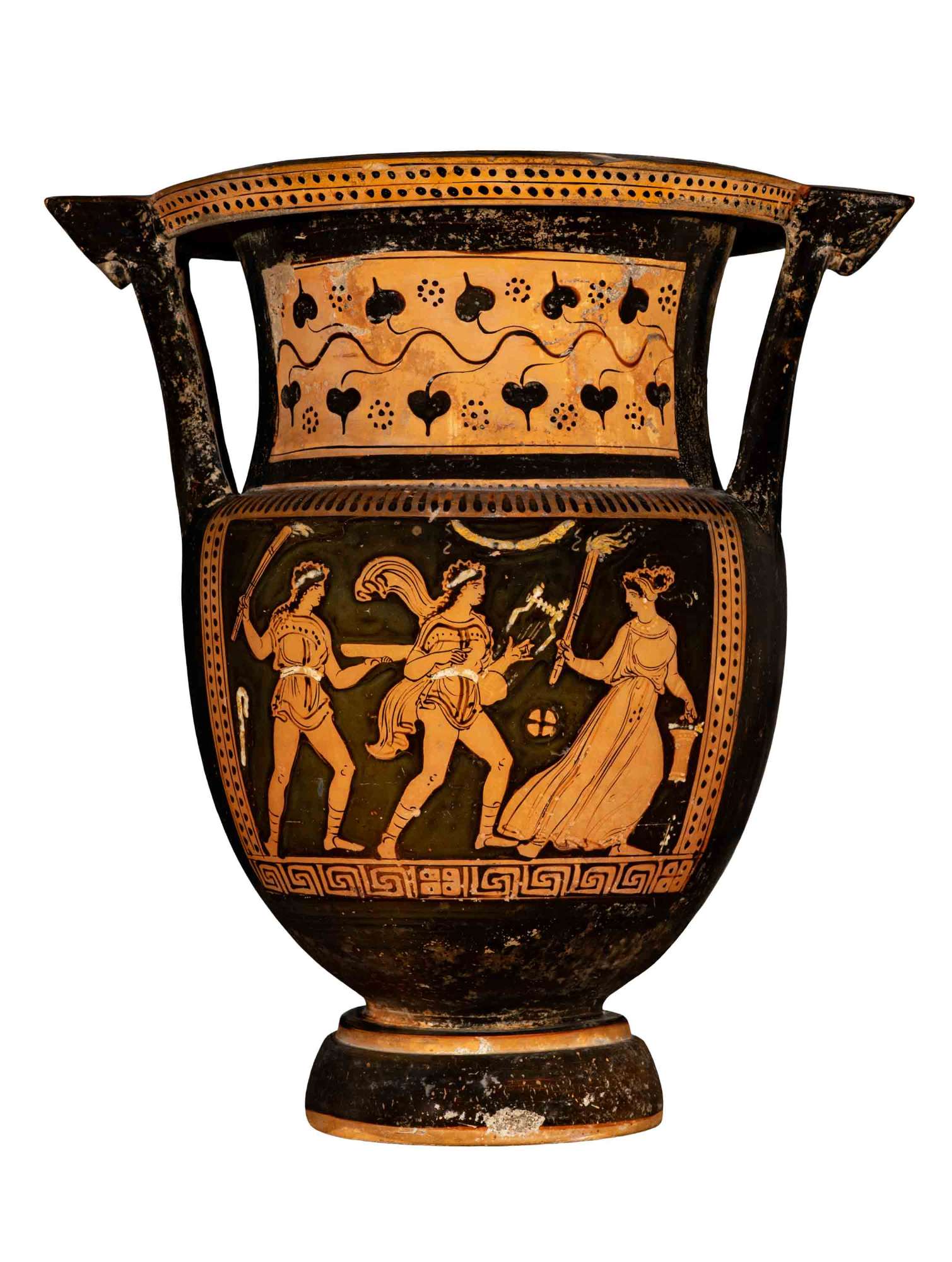 Cratere a colonnette apulo a figure rosse. Lato A: donna in corsa con fiaccola e situla, due giovani rispettivamente con lira e plettro, patera e fiaccola. Lato B: tre giovani ammantati, phiale e palla.