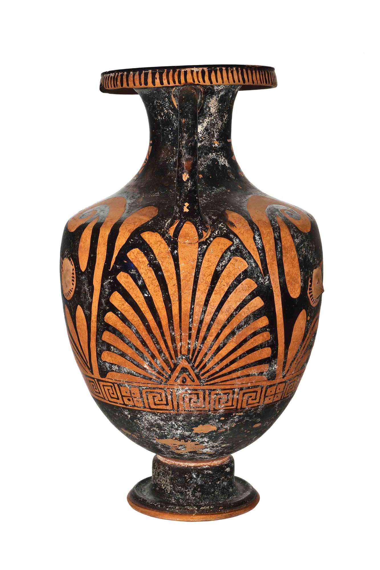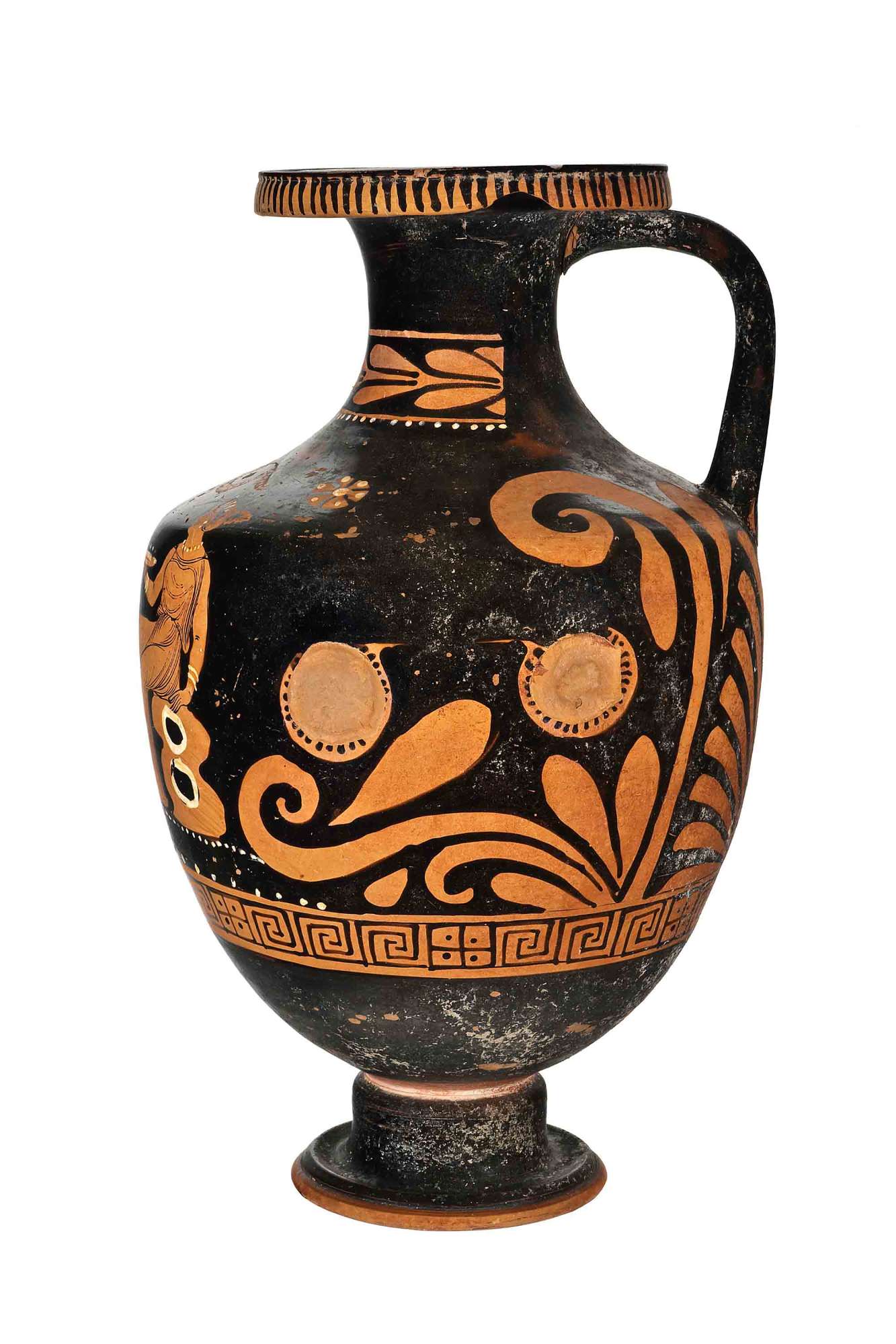 Hydria apula a figure rosse le cui due anse si sono staccate lasciando le cicatrici nel punto di adesione. Donna seduta con patera con offerte e giovane nudo con serto; elementi vegetali sotto l'ansa.