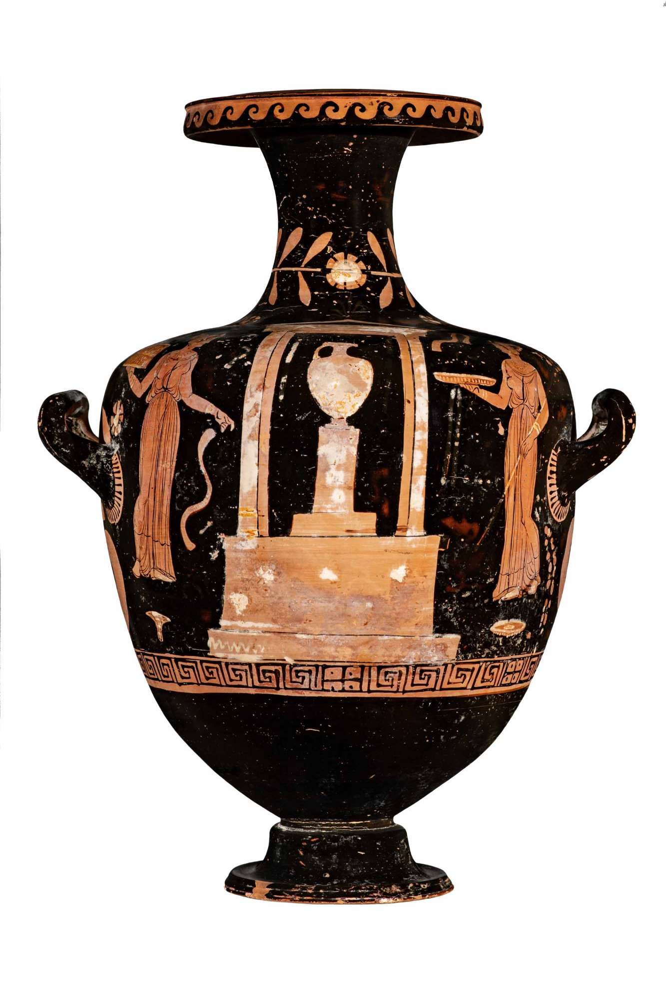 Kalpis apula a figure rosse con scena di offerta presso un tempietto: due donne in atto di offerta presso un tempietto al cui centro vi è, su un pilastro, un'hydria.