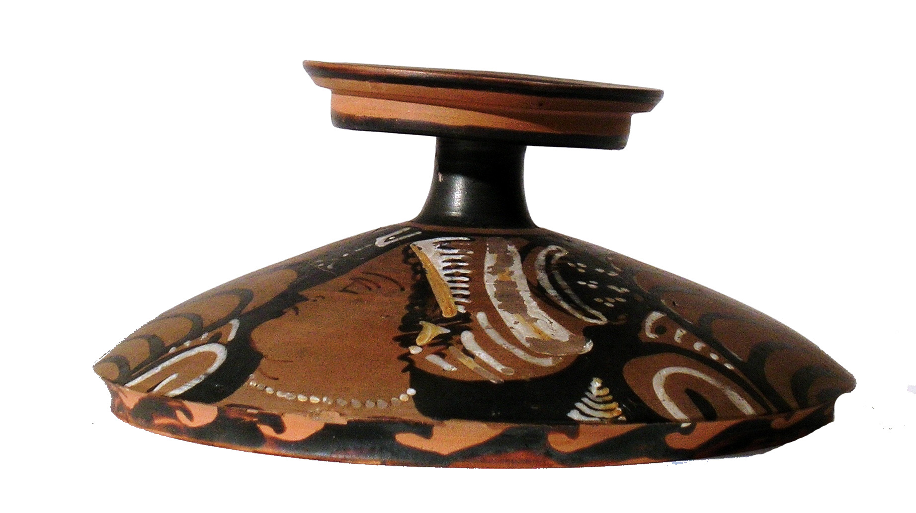 Lekanis a figure rosse con decorazione a fascia di linee verticali sulla coppa e due teste femminili con mitella tra palmette sul coperchio.