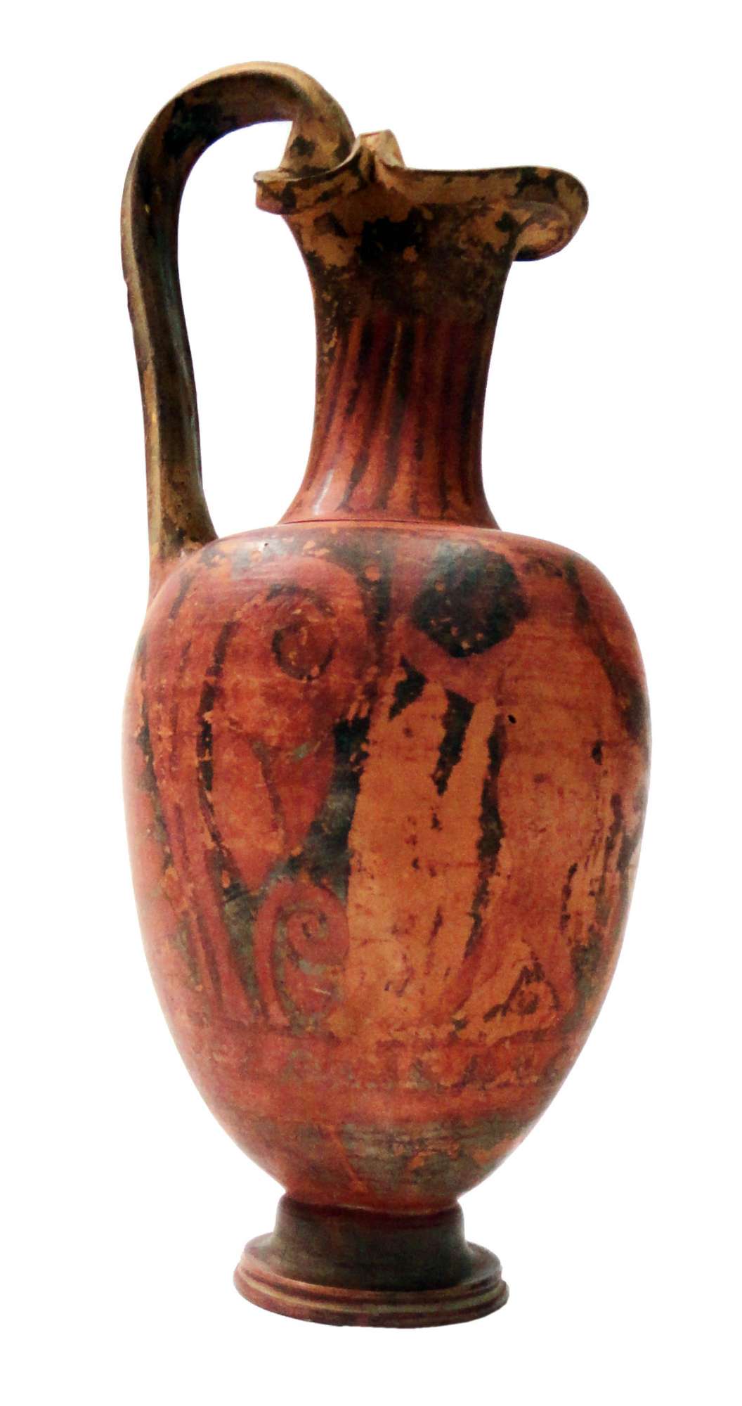 Oinochoe apula a figure rosse con ansa sopraelevata con scena d'offerta: un uomo nudo andante retrospiciente; una donna in marcia con peplo; molto sbiadite.