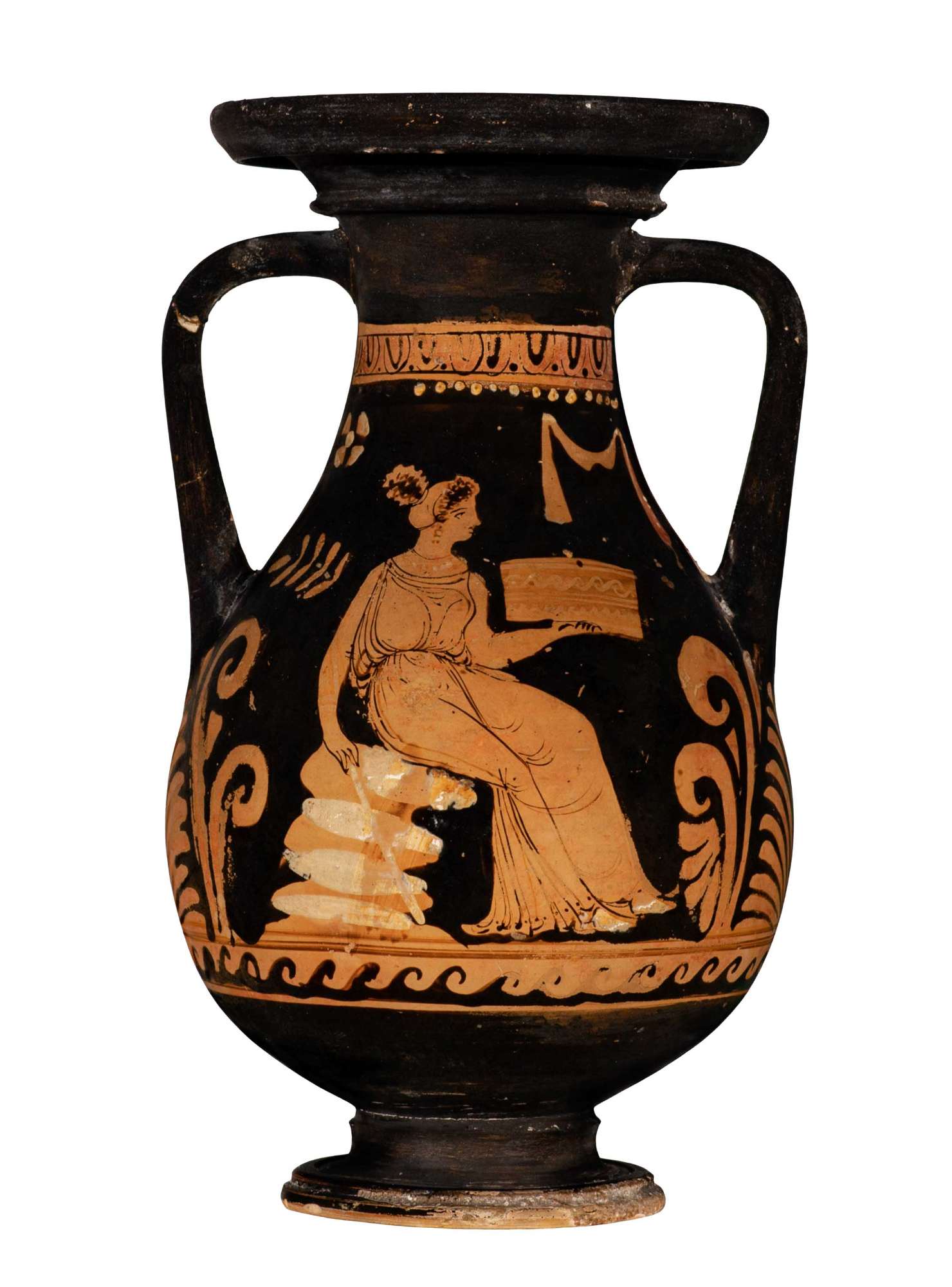 Orlo revoluto a profilo convesso con labbro estroflesso su base modanata con profilo angolato; spalla leggermente obliqua. Al di sotto delle scene figurate, entro fascia risparmiata corrente per tutta la circonferenza del vaso, decorazione a onde correnti destrorse campite a vernice nera. Anse e interno verniciato. Lato A: figura femminile seduta su roccia con tirso e cista Figura femminile di tre quarti con testa di profilo rivolta verso destra seduta su sedile roccioso sovradipinto in bianco; indossa un lungo chitone smanicato, ripreso in vita e decorato lungo l’orlo inferiore da una fila di puntini in corrispondenza delle pieghe del tessuto; le linee della gamba d. rimangono visibili attraverso la veste, mentre della s. si percepiscono solo i volumi al di sotto del chitone. I capelli sono raccolti in una mitra, che lascia fuoriuscire ricce ciocche su nuca e fronte. Arricchiscono la figura orecchini pendenti, due bracciali sovradipinti e una collana con filo in vernice nera e vaghi pendenti sovradipinti in bianco. I piedi sembrano calzati, per la presenza di sovraddipinture in bianco e giallo. Il braccio sinistro., flesso, regge cesta con coperchio, con sovraddipinture in bianco o giallo ormai evanide: i bordi superiore e inferiore evidenziati da una linea continua; la decorazione è costruita su due registri suddivisi da una doppia linea continua centrale; la decorazione del registro superiore è costituita a una serie di onde correnti; quella inferiore da una linea continua ondulata. La mano destra, posata sulla seduta, stringe tra le dita il bastone del tirso, che si appoggia anche al gomito. Il coronamento del tirso è costituito da 4 coppie di foglie e una foglia singola al vertice superiore. Nel campo in alto, subito al di sotto della fascia risparmiata con decorazioni ovulo-guscio-punto, fila di palline sovradipinte, che partono in corrispondenza della testa della figura femminile fino all’ansa d. Poco sotto, sulla s., rosetta quadripetala con profili e bottone centrale sovradipinto; a destra benda appesa con sovraddipinture in bianco (ormai del tutto evanide). Lato B: testa femminile con stephanè Testa femminile di profilo rivolta verso sinistra Fronte e naso costituiti da un’unica linea continua appena bombata all’attacco tra fronte e naso; occhio con dettaglio di palpebra superiore e inferiore non chiusi, rima superiore, pupilla e sopracciglio ben definiti. Breve tratto segna inferiormente la narice. Probabili sbaffi di vernice su mento e tra zigomo e collo della figura. I capelli sono raccolti in una mitra, bordato alle estremità da una doppia linea in vernice diluita, cui è sovrapposta una stephanè ad alti raggi in giallo sovradipinto indossa collana con filo continuo a vernice nera da cui pende una serie di vaghi circolari sovradipinti in bianco . Nel campo, in alto, tre elementi isolati: una rosetta a sei petali con profili e bottone centrale sovradipinti in bianco, un grappolo d’uva risparmiato con acini circolari in bianco sovradipinto e una finestra strombata profilata in bianco. Poco sotto, sulla destra., ulteriore rosetta a otto petali profilati e bottone centrale sovradipinto.