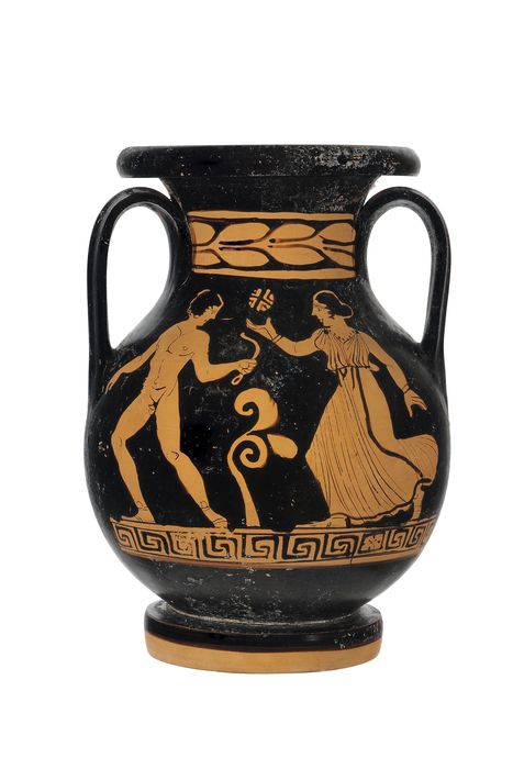 Pelike apula a figure rosse. Lato A: atleta nudo in corsa con strigile; donna vestita di chitone in corsa con palla a spicchi. Lato B: due giovani ammantati, halteres.