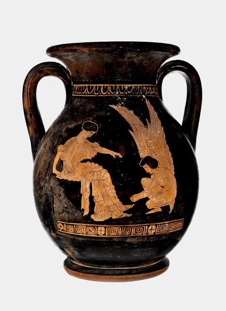 Pelike a figure rosse. Lato A: Eros allaccia il sandalo ad una fanciulla in lungo chitone seduta. Lato B: Un giovane ammantato con lungo bastone nella destra.