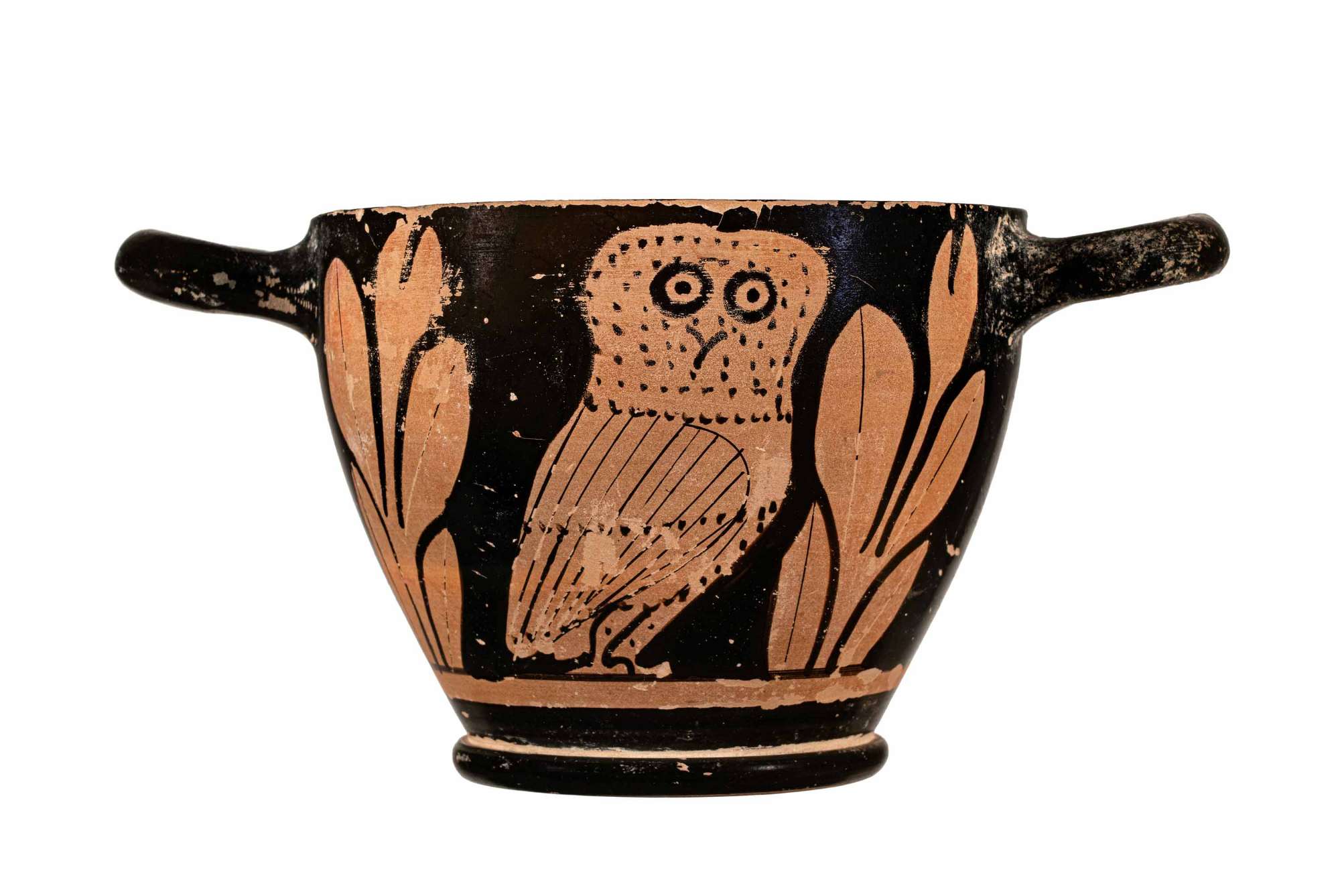 Skyphos glaux attico a figure rosse. Lato A e B: civetta tra alloro o olivo.