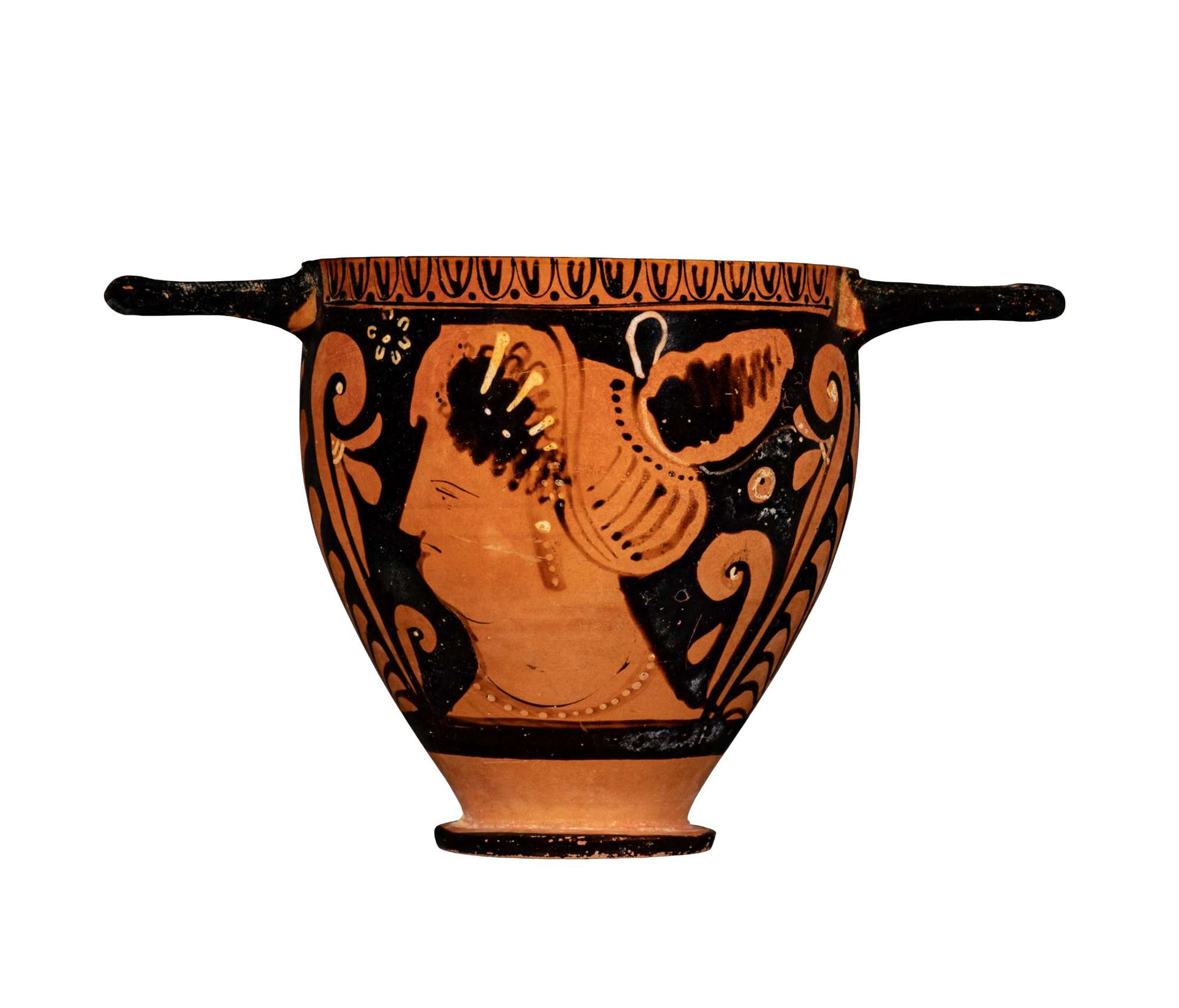 Skyphos apulo a figure rosse, dettagli bianchi; palmette sotto le anse. Lato A: donna seminuda seduta con specchio e bacile con offerte e palla a spicchi. Lato B: testa femminile con mitella.
