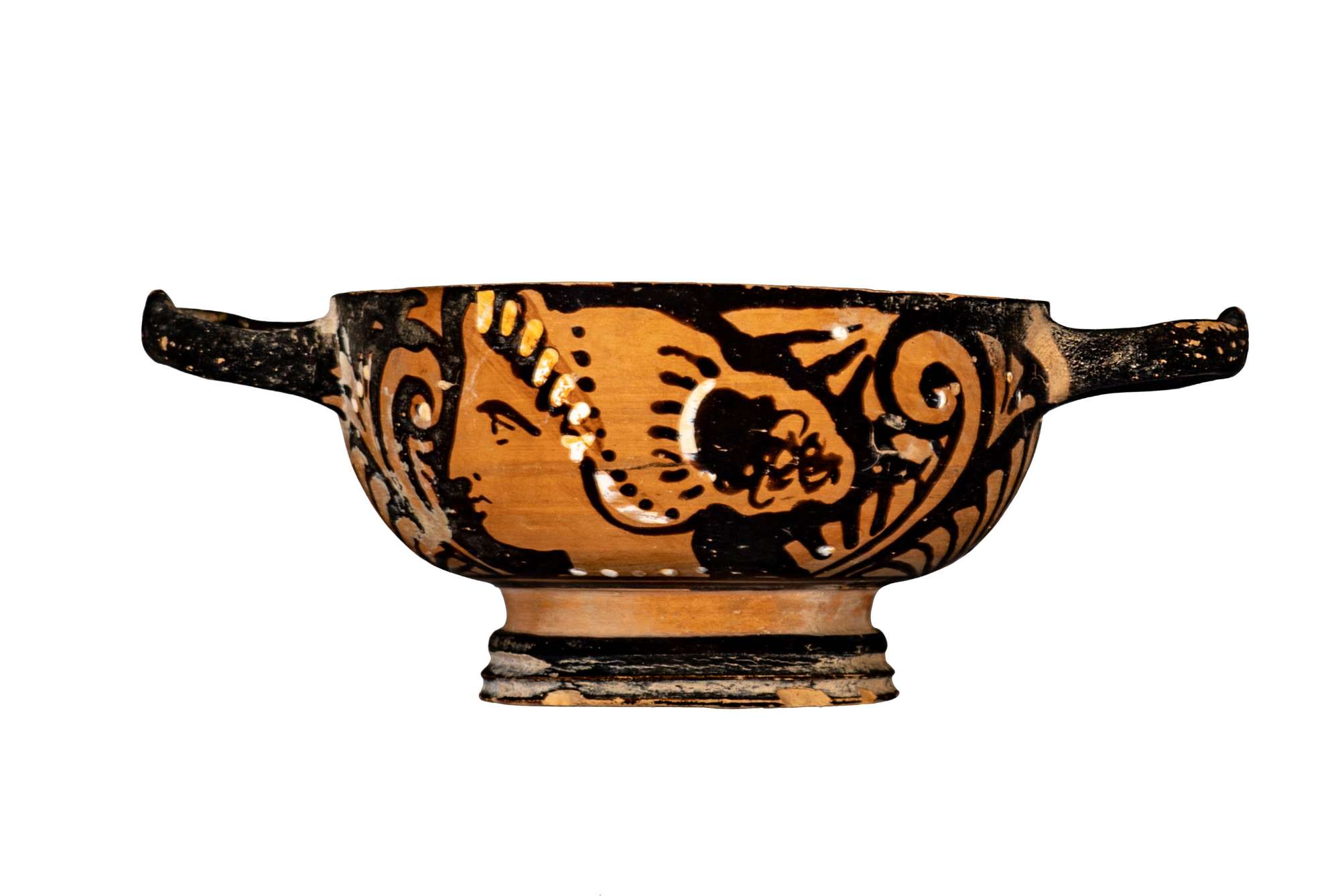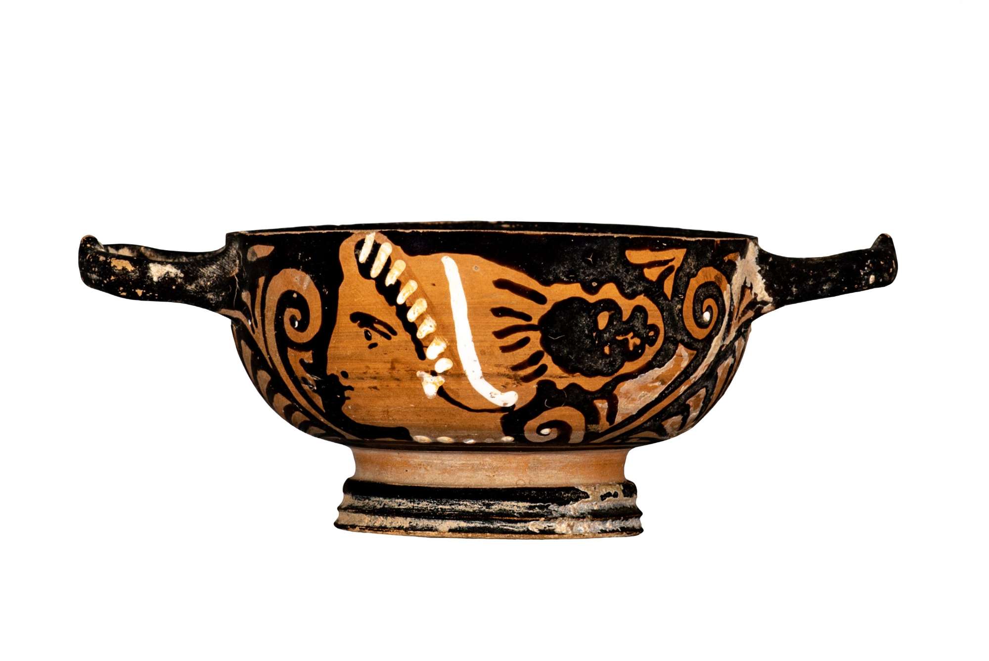Labbro indistinto; corpo ovoide compresso; Sul corpo motivi floreali Lato A: testa femminile con mitra Testa femminile di profilo rivolta verso sinistra; fronte e naso costituiti da due linee contigue appena bombate; naso aquilino; occhio con dettaglio di spesso sopracciglio, rima superiore e inferiore non coincidenti e con pupilla centrale in vernice nera diluita. La narice è caratterizzata da un piccolo puntino in nero; labbro superiore e inferiore distinti per mezzo di una breve linea a vernice nera leggermente tendente verso il basso; mento prominente e arrotondato. I capelli sono raccolti in una mitra decorata da una spessa linea sovradipinta in bianco e da una corona di tratti disposti a raggiera presso l’apertura sulla nuca; alla mitra è sovrapposta una stephanè a raggi sovradipinti in bianco. Orecchini pendenti dalla forma triangolare in bianco sovradipinto; al collo, collana ad unico filo di vaghi in bianco sovradipinto. Lato B: testa femminile con mitra Stesso motivo del lato A. Testa rivolta verso sinistra.