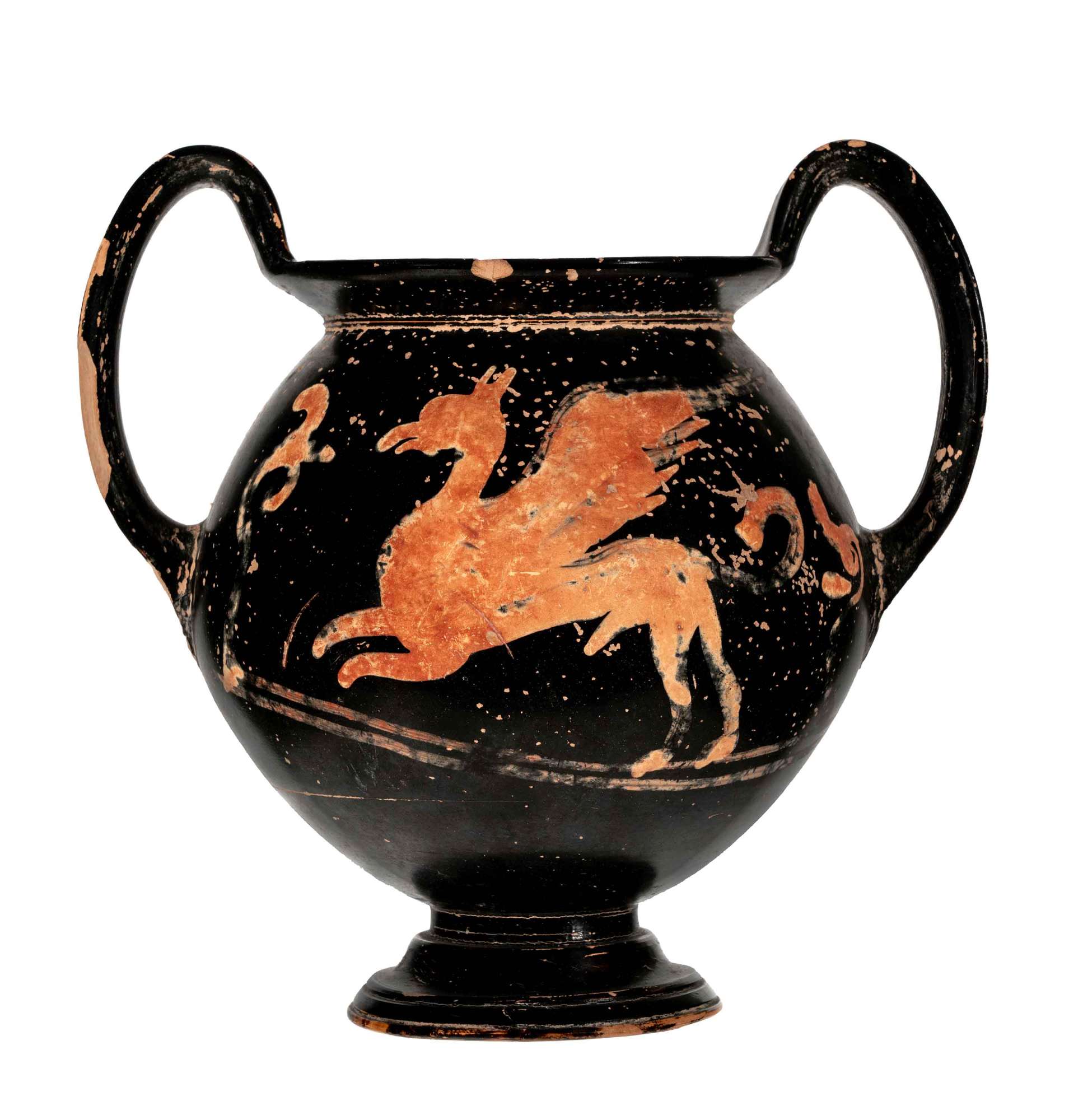 Vaso kantharoide a figure rosse con immagine di grifo in corsa tra viticci. Sull'altro lato palmette.