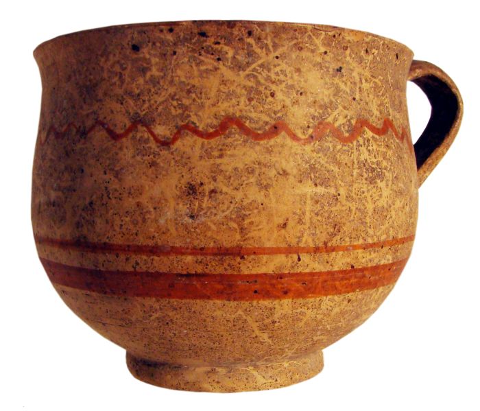 boccale con corpo a sacco con labbro leggermente aggettante, ansa a nastro verticale non sormontante, piede troncoconico. Decorazione in rosso con sottili fasce concentriche in corrispondenza della circonferenza massima e motivo a tremolo sulla spalla.