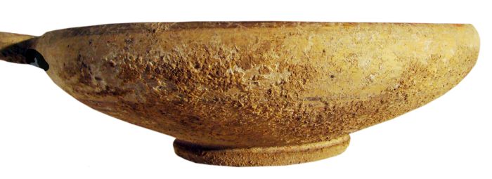 Coppa monoansata. Orlo arrotondato, labbro fortemente introflesso, vasca a profilo convesso, piede a disco, ansa a nastro spessa e obliqua, impostata sotto l’orlo, sormontante. Decorazione monocroma in bruno con fasce orizzontali all’esterno della vasca decorata da linee nere e rosse sul corpo assai sbiadite e coperte da incrostazioni.