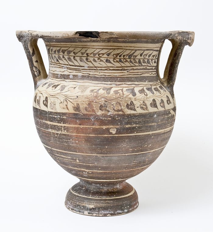 Cratere a colonnette tornito a fasce e di stile misto. Orlo a fascia e modanatura concava, nel quale confluiscono, tramite la piastra, le anse a colonnette; collo cilindrico a profilo concavo, corpo ovoidale con spalla tondeggiante, piede a echino. Decorazione a vernice monocroma rossa e brunastra su fondo naturale di argilla, con ramo d’ulivo e linee ondulate sul collo e un fregio di foglie d’edera sulla spalla, con ampie fasce parallele interamente campite a vernice rossastra sul ventre; campitura rossastra nell’orlo, nelle anse e nel piede.