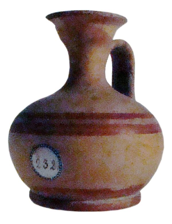 Lekythos ariballica. Bocchello troncoconico rovesciato, con collo cilindrico breve, spalla piatta e corpo globulare schiacciato, piede ad anello, con ansa a nastro impostata verticalmente tra il collo e la spalla. Decorazione monocroma in rosso con fasce parallele a metà del ventre e nella parte inferiore; campito il piede.