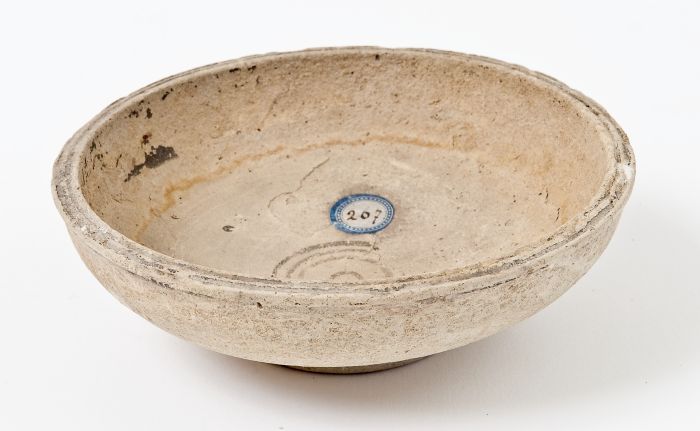 Coppa con vasca profonda, a profilo convesso. Fondo concavo e profilo indistinto, piede ad anello. Decorazione in rosso diluito su fondo acromo: all’interno, cerchi concentrici sul fondo; all’esterno, interamente acroma.