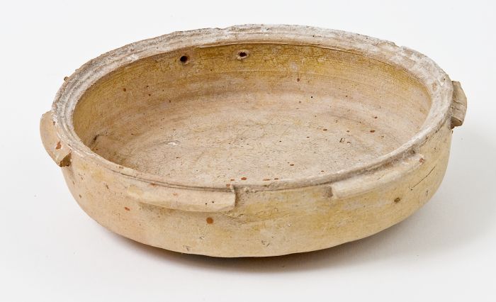 Coppa con vasca fonda, a profilo convesso, piede ad anello, labbro orizzontale a listello interrotto, con sei prese orizzontali, di cui almeno una presenta una coppia di fori. Acromo sia all’interno che all’esterno.