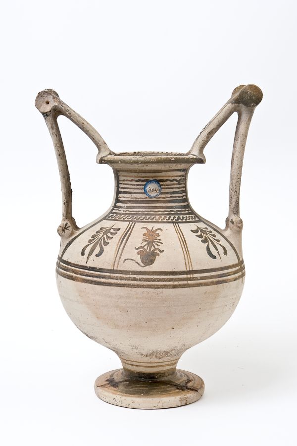 Trozzella in ceramica messapica. Orlo estroflesso e appiattito, alto collo cilindrico, a profilo leggermente concavo, corpo globoso, con anse verticali sormontanti, impostate sull’orlo e sulla spalla, provviste di doppia coppia di dischi (“trozze”), di cui quelli superiori sono di maggiori dimensioni; piede a disco, unito al corpo mediante un piccolo fusto. Decorazione monocroma in nero su fondo naturale di argilla; su entrambi i lati, sul collo, linee orizzontali diritte e a tremolo, con motivo a onde correnti nella fascia inferiore; sulla spalla, una serie di pannelli definiti da linee parallele, in cui campeggiano palmette e una foglia d’edera, un fiore campanuliforme e una rosa; all’altezza del ventre, una fascia a tre linee parallele; sul fusto del piede, fasce; sull’orlo, tratti; sui dischi linee radiali.