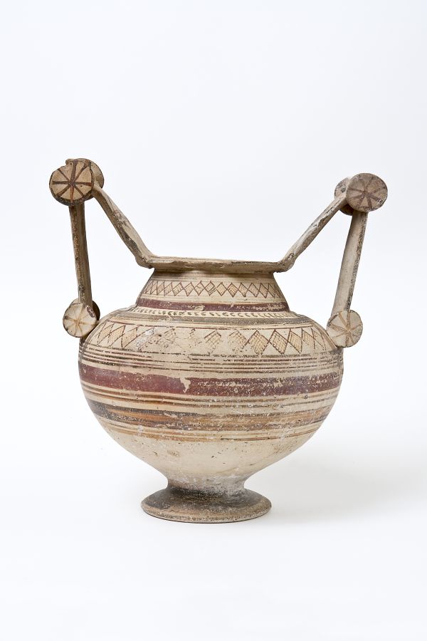 Trozzella in ceramica messapica. Orlo estroflesso e appiattito, basso collo troncoconico, a profilo leggermente convesso, corpo a profilo biconico (cosiddetto “a cipolla”, con anse verticali sormontanti, impostate sull’orlo e sulla spalla, provviste di doppia coppia di dischi (“trozze”), di cui quelli superiori sono di maggiori dimensioni; piede a disco, unito al corpo mediante un piccolo fusto. Decorazione bicroma in bruno e rosso su fondo naturale di argilla; su entrambi i lati, sul collo, linee orizzontali diritte e una fascia di rombi reticolati, con motivo a onde correnti nella fascia inferiore; sulla spalla, fascia di rombi reticolati; nella parte inferiore del corpo, fasce e linee parallele alternate; sul fusto del piede, linee parallele; sull’orlo e sulle anse, tratti; sui dischi linee radiali. In corrispondenza del ventre, una lieve rientranza (avvenuta ancora in fase di cottura).