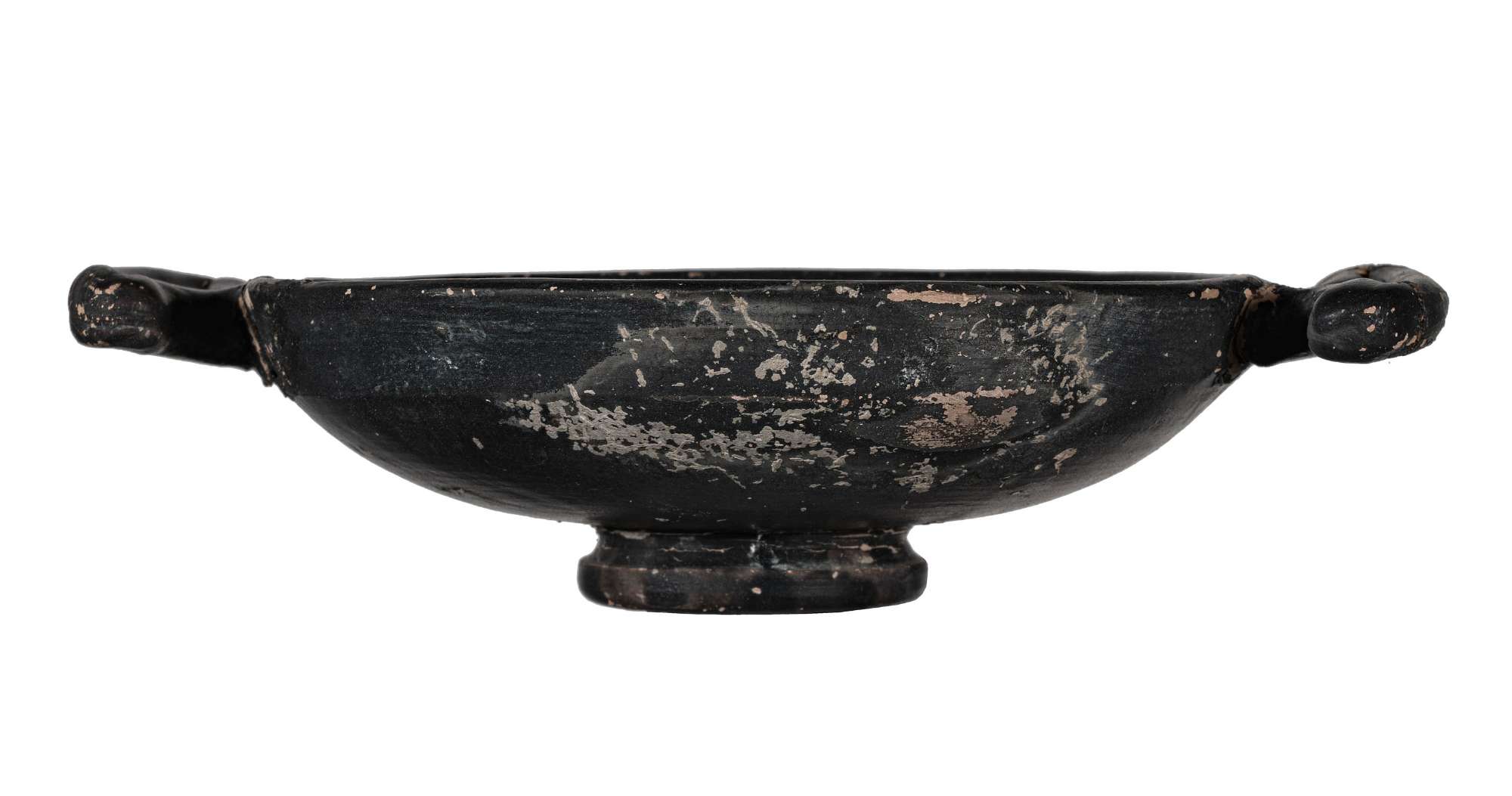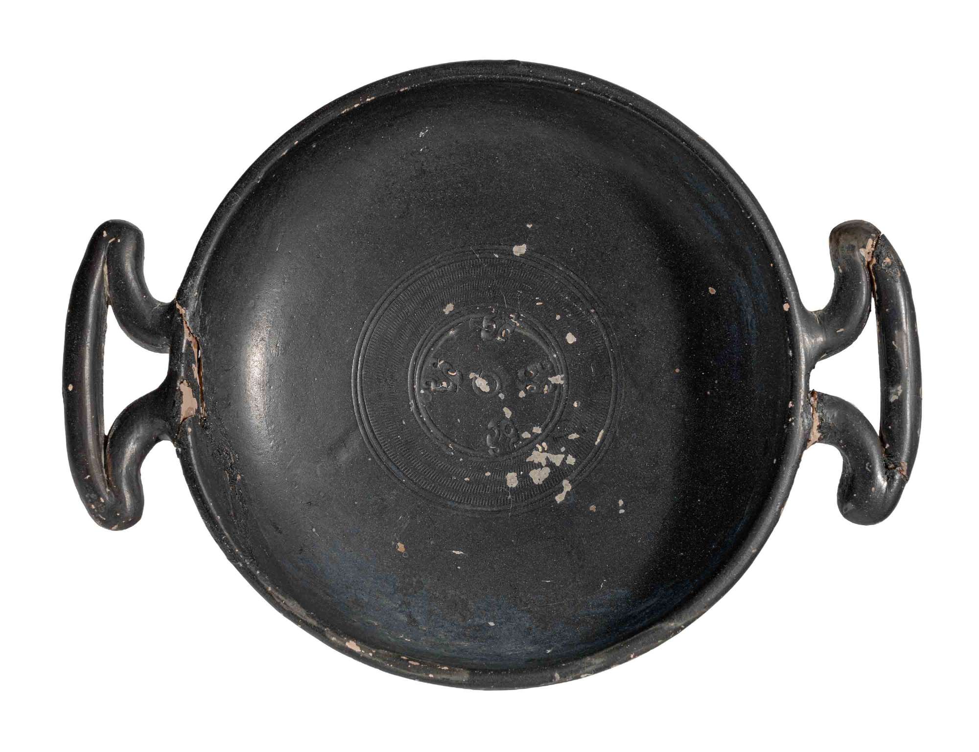 Kylix ad anse orizzontali a vernice nera; due disegni ornamentali geometrici impressi all'interno.