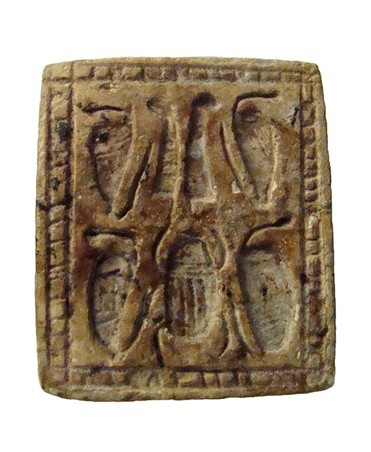 Amuleto in faience, in forma di piastrina rettangolare. Su una faccia vi è il volto del dio Bes, con la barba, le orecchie sporgenti, il largo naso piatto e le sopracciglia accentuate, con in capo la corona di piume di struzzo; sull'altra faccia, invece, uno scarabeo sormontato da due piume di struzzo si trova tra due coppie di urei, disposti araldicamente. L'amuleto ha un foro passante verticale.