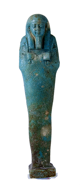 Statuina funeraria mummiforme che indossa parrucca tripartita e barba divina intrecciata. Le mani incrociate ed affiancate tengono a sinistra una zappa e a destra un piccone. Dalla spalla sinistra pende una sacca. Il pilastro dorsale e la base sono presenti. L’ushabti è privo di iscrizioni.