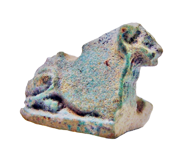 Amuleto in faience lavorato a tutto tondo e in modo alquanto sommario, raffigurante un leone accucciato su una piccola base; sulla schiena doveva esserci l'anello di sospensione, ora spezzato assieme a una parte della figurina.