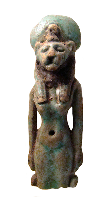 Amuleto in faience raffigurante Sekhmet con disco solare e pilastro dorsale, dall'Egitto