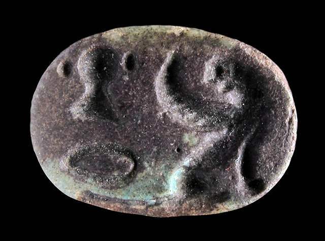 Scaraboide in faience; Sul ventre è rappresentata una sfinge alata con accanto segni geroglifici. Il dorso è molto consumato ed ormai liscio; il colore originale doveva essere verde chiaro. Foro passante longitudinale.