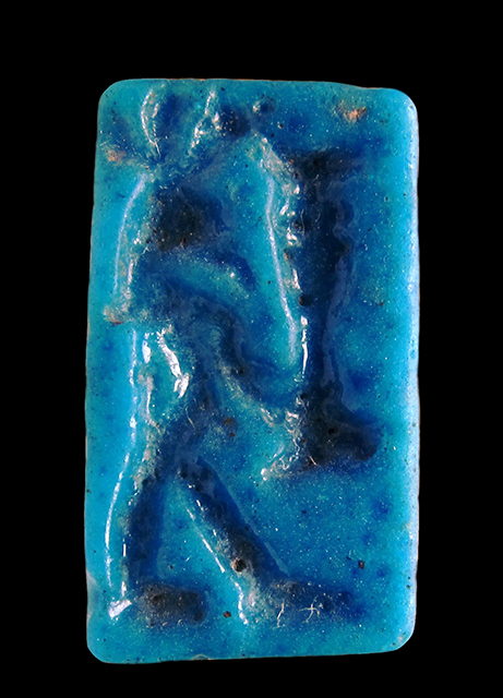 Sigillo in faience turchese con rappresentazione di una divinità, probabilmente il dio del Nilo Hapi, che tiene in mano un vaso hes. L’altra faccia è liscia. Senza foro.