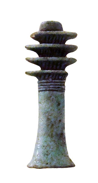 Amuleto in faience, con pilastro dorsale forato, che raffigura il geroglifico "djed", a forma di pilastro con quattro espansioni nella parte superiore, che indica stabilità, immutabilità, eternità, resurrezione, ma anche forza inestinguibile ed incorruttibilità. Già nella Prima Dinastia (3150 – 2925 a.C.) era un pilastro intorno al quale venivano legate spighe di grano; dal Nuovo Regno (1543 – 1078 a.C.) fu interpretato anche come spina dorsale di Osiride. Un djed, meglio se in oro, era posto sulla gola del defunto durante il suo funerale, con il compito di farlo divenire uno spirito santificato e perfetto, un seguace di Osiride. Nel capitolo 155 del Libro dei Morti l’amuleto fa sì che “è tua nuovamente la tua spina dorsale e le tue vertebre, così che puoi tornare a muoverti...”.