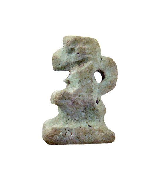 Amuleto in faience, modellato a tutto tondo, anche se in maniera molto schematica. Raffigura un babbuino accucciato, che tiene le zampe anteriori poggiate sulle ginocchia. Sulla schiena vi è un anello di sospensione.