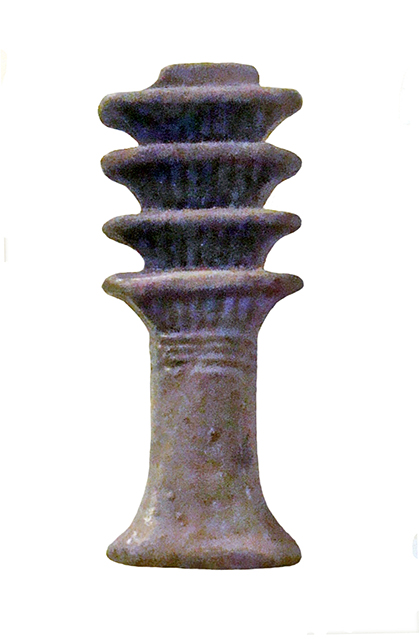 Amuleto in faience, con pilastro dorsale forato, che raffigura il geroglifico "djed", a forma di pilastro con quattro espansioni nella parte superiore, che indica stabilità, immutabilità, eternità, resurrezione, ma anche forza inestinguibile ed incorruttibilità. Già nella Prima Dinastia (3150 – 2925 a.C.) era un pilastro intorno al quale venivano legate spighe di grano; dal Nuovo Regno (1543 – 1078 a.C.) fu interpretato anche come spina dorsale di Osiride. Un djed, meglio se in oro, era posto sulla gola del defunto durante il suo funerale, con il compito di farlo divenire uno spirito santificato e perfetto, un seguace di Osiride. Nel capitolo 155 del Libro dei Morti l’amuleto fa sì che “è tua nuovamente la tua spina dorsale e le tue vertebre, così che puoi tornare a muoverti...”.
